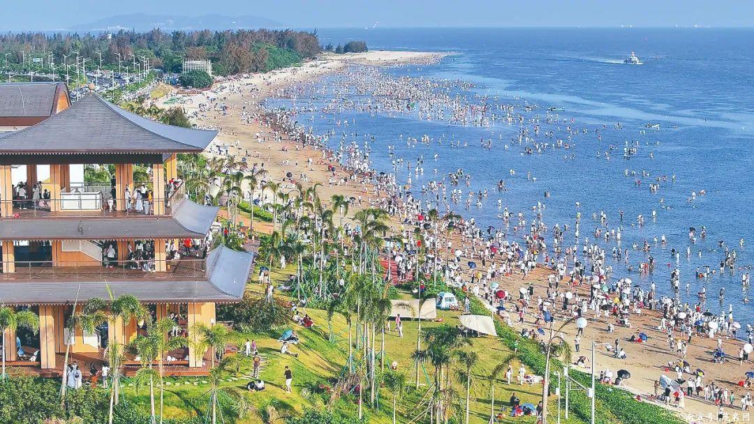 二楼观海露台是绝佳打卡地。白色遮阳伞下,游客们举着手机对着碧海蓝天按下快门。不远处沙滩上,孩子们挖海螺、抓螃蟹,洋溢着欢乐。